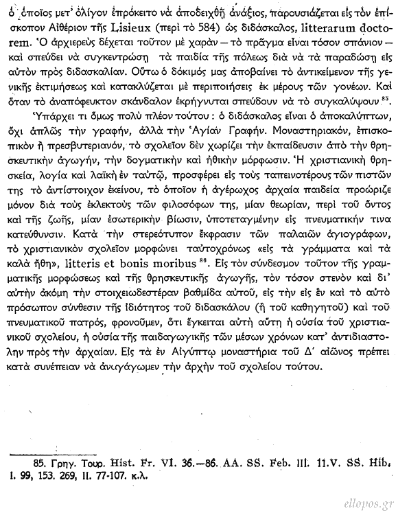 Περιεχόμενα: Ἡ θρησκευτικὴ ἐκπαίδευση ||| Ὁ χριστιανισμὸς θρησκεία πεπαιδευμένων ||| Τὸ ραββινικὸ σχολεῖο ||| Χριστιανικὰ σχολεῖα σὲ βαρβαρικὲς χῶρες ||| Χριστιανισμὸς καὶ κλασικισμός ||| Χριστιανικὴ ἀντίθεση στὴν κλασικὴ παιδεία ||| Ὁ χριστιανισμὸς ἀποδέχεται τὸ κλασικὸ σχολεῖο ||| Οἱ χριστιανοὶ ἐντὸς τῆς κλασικῆς ἐκπαιδεύσεως ||| Ὁ νόμος τοῦ Ἰουλιανοῦ γιὰ τὰ σχολεῖα ||| Μικρὴ ἡ ἐπίδραση τοῦ χριστιανισμοῦ ἐπὶ τοῦ σχολείου ||| Ἀνώτερες θεολογικὲς σχολές ||| Στὴν Ρώμη καὶ τὴν Ἀλεξάνδρεια τὸν 3ο αἰῶνα ||| Ἐξαφάνιση τῶν σχολείων αὐτῶν ||| ΕΜΦΑΝΙΣΗ ΤΩΝ ΧΡΙΣΤΙΑΝΙΚΩΝ ΣΧΟΛΕΙΩΝ ΜΕΣΑΙΩΝΙΚΟΥ ΤΥΠΟΥ ||| Τὸ μοναστηριακὸ σχολεῖο στὴν Ἀνατολή ||| Ἡ ἀμυδρὴ ἀκτινοβολία του ||| Τὸ μοναστηριακὸ σχολεῖο στὴν Δύση ||| Τὸ ἐπισκοπικὸ σχολεῖο ||| Τὸ πρεσβυτεριανὸ σχολεῖο ||| Ἡ ἀρχὴ τῶν μεσαιωνικῶν σχολείων