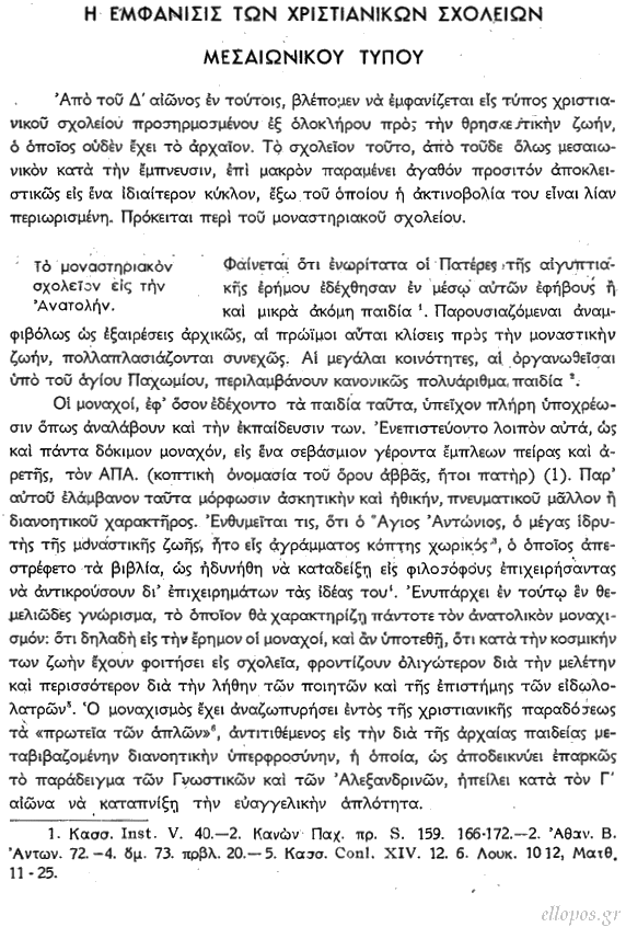 Περιεχόμενα: Ἡ θρησκευτικὴ ἐκπαίδευση ||| Ὁ χριστιανισμὸς θρησκεία πεπαιδευμένων ||| Τὸ ραββινικὸ σχολεῖο ||| Χριστιανικὰ σχολεῖα σὲ βαρβαρικὲς χῶρες ||| Χριστιανισμὸς καὶ κλασικισμός ||| Χριστιανικὴ ἀντίθεση στὴν κλασικὴ παιδεία ||| Ὁ χριστιανισμὸς ἀποδέχεται τὸ κλασικὸ σχολεῖο ||| Οἱ χριστιανοὶ ἐντὸς τῆς κλασικῆς ἐκπαιδεύσεως ||| Ὁ νόμος τοῦ Ἰουλιανοῦ γιὰ τὰ σχολεῖα ||| Μικρὴ ἡ ἐπίδραση τοῦ χριστιανισμοῦ ἐπὶ τοῦ σχολείου ||| Ἀνώτερες θεολογικὲς σχολές ||| Στὴν Ρώμη καὶ τὴν Ἀλεξάνδρεια τὸν 3ο αἰῶνα ||| Ἐξαφάνιση τῶν σχολείων αὐτῶν ||| ΕΜΦΑΝΙΣΗ ΤΩΝ ΧΡΙΣΤΙΑΝΙΚΩΝ ΣΧΟΛΕΙΩΝ ΜΕΣΑΙΩΝΙΚΟΥ ΤΥΠΟΥ ||| Τὸ μοναστηριακὸ σχολεῖο στὴν Ἀνατολή ||| Ἡ ἀμυδρὴ ἀκτινοβολία του ||| Τὸ μοναστηριακὸ σχολεῖο στὴν Δύση ||| Τὸ ἐπισκοπικὸ σχολεῖο ||| Τὸ πρεσβυτεριανὸ σχολεῖο ||| Ἡ ἀρχὴ τῶν μεσαιωνικῶν σχολείων